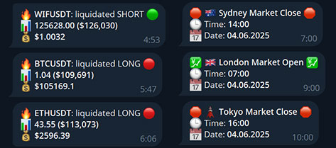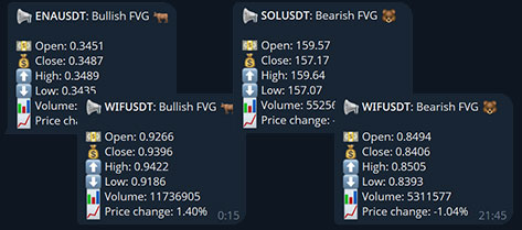 Get real-time alerts for market sessions, momentum shifts, Fair Value Gaps, and large liquidations — all delivered straight to your Telegram. No setup needed — just plug and play.